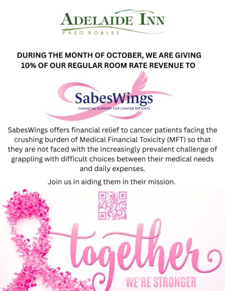 Adelaide Inn is going pink! From our lobby to our staff, we are going all-in for Breast Cancer Awareness Month! PLUS, we are donating 10% of our regular room rate revenue for the entire month of October to SabesWings.